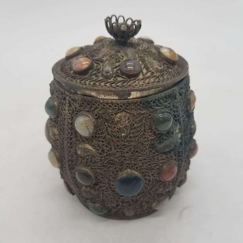 Antik cambodjansk sølvsmykkeskrin formet som due, fra ca. 1900–1910, oprindelse Asien, mål 8 cm højde, 11 cm længde, 4 cm bredde, vægt 93 g. Klik på den blå "gå til varen" knap, for at købe eller byde på denne vare. Den samlede pris vil blive vist inden du afgiver dit bud.