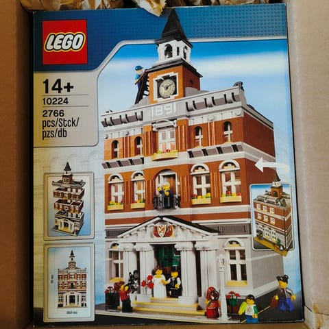 Lego Town Plan 10184 (2008), 50 års jubilæumssæt, komplet med brugsanvisning; dele i erstatningsposer, originale poser til stede; æske åben med meget få slidmærker; 1981 dele, 8 minifigurer, benzinstation, rådhus, biograf, 2 biler og 3 guld-årsdagssten. Klik på den blå "gå til varen" knap, for at købe eller byde på denne vare. Den samlede pris vil blive vist inden du afgiver dit bud.