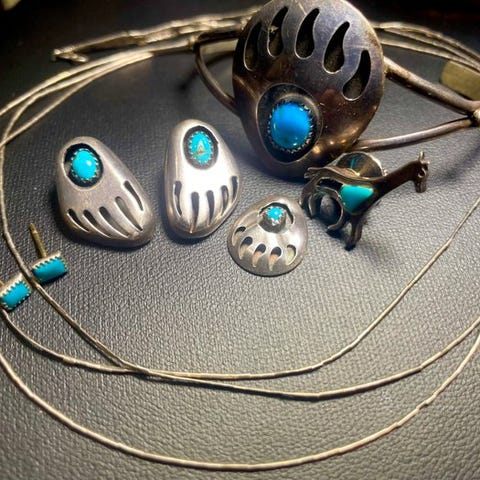 Denne 25 tommer lange halskæde repræsenterer traditionel Native American-smykkekunst fra det sydvestlige USA, dateret til midten til slutningen af det 20. århundrede. Stykket har udskårne turkis-bjørnefetisher, der veksler med lapis lazuli-perler, trådet sammen med heishi-skalperler. Bjørnefetisher-halskæder har stor kulturel og åndelig betydning i Native American-traditioner, især blandt Zuni-folket. Bjørnen symboliserer styrke, selvreflektion og heling i mange Native American-kulturer. Samlingen omfatter også flydende sølv, armbånd i sterlingsølv (10 tommer) med turkise perleindsatser.