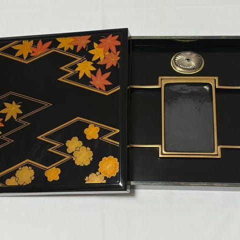 Træudskåret Suzuribako designet med udskårne fugle- og landskabsfigurer, det rummer også en indbygget blekksten og vanddryppe (udskåret to svaler og bølger).