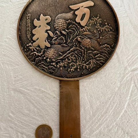 To japanske bronsemirrors i en lakbox, dateret fra slutningen af det 19. århundrede til begyndelsen af det 20. århundrede, med dimensionerne 3 cm i højden, 12 cm i bredden og 12 cm i dybden, i god stand. Klik på den blå "gå til varen" knap, for at købe eller byde på denne vare. Den samlede pris vil blive vist inden du afgiver dit bud.
