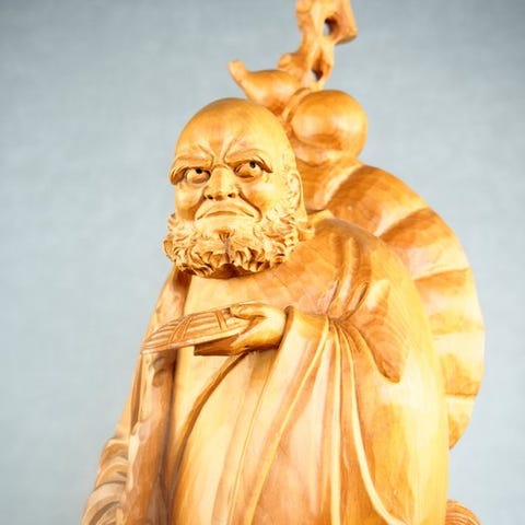 Dette er et traditionelt japansk træ Buddha-hovedskulptur, udskåret i en karakteristisk halvansigt (halv-relief) stil og monteret på en firkantet træbase.