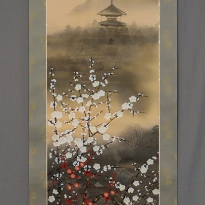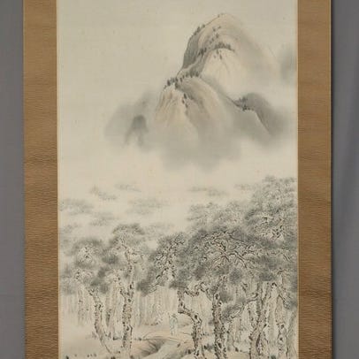 Shoka underskriver Morning Crow på silke, en blæk- og blege farve-betrukken hængebølge fra Japan fra Shōwa-perioden (1926–1989), måler 185 cm i højden og 52,8 cm i bredden, vejer 1,0 kg, i fair stand med forbrændinger, muld- og rynker på billedet og monteringen, monteret på silke med trærorender. Klik på den blå "gå til varen" knap, for at købe eller byde på denne vare. Den samlede pris vil blive vist inden du afgiver dit bud.