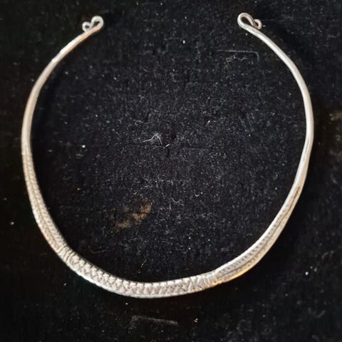 Den stammer fra 80'erne og er i 925-sølv (brunet på den øverste del) med en række røde cylindriske koraller ovenpå.
