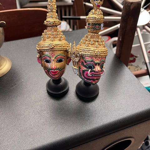 Håndmalede med øjenbryn af naturligt hår fastgjort med små søm og overskæg i naturlig fiber (formodentlig hestehår); indvendigt ses det, at de er udskåret i hånden med en udskæringskniv.