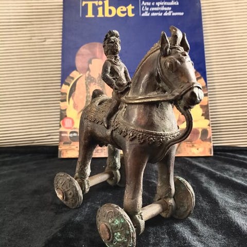 Antik ceremoniel vogn i bronze og smedet jern, fint håndværket og trukket af to elefanter. Dette manufaktur, tungt og solidt, er ikke blot en dekorativ genstand, men en miniaturegengivelse af en Ratha, den hellige vogn anvendt i indiske eller nepalesiske ritualprocessioner. Dens historie og dens dybe kulturelle betydning gør den til et helt unikt samlerobjekt.