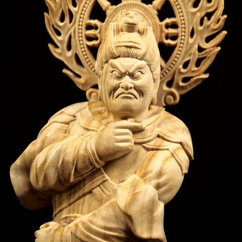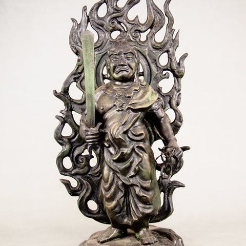 En træudskåret, forgyldt og polykromeret Hōnen (法然) og Zendo Daishi-statue fra Meiji-perioden, 27 cm høj og 9,5 cm bred, i god stand med snavs og slid, laktab og små skader; én figur mangler hånd og fødder; sælges som beset. Klik på den blå "gå til varen" knap, for at købe eller byde på denne vare. Den samlede pris vil blive vist inden du afgiver dit bud.