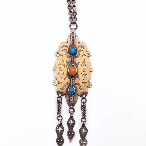 Fremstillet af solidt sølv og beriget med delikate gyldne detaljer, viser dette stykke enestående håndgravering og traditionelle ornamentale motiver. De indviklede blomstrede og geometriske mønstre er omhyggeligt gravet i overfladen og fremhæver håndværket og den kulturelle arv i Turkmensk smykkefremstilling.