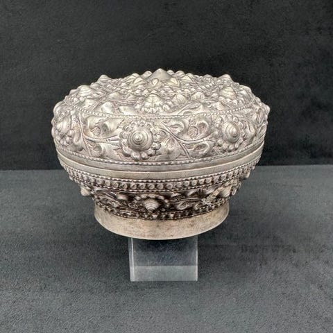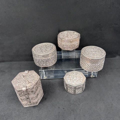 Ægte sølv tubulær æske beregnet til at indeholde en amulet, for eksempel et vers fra koranen, oprindelig fra Yemen. Tuben åbner sig ikke eller åbner sig ikke længere. Smukt håndværk af sølvsmedekunst. Ved at pendlerne støder hinanden udsender de en let klingende lyd, som ifølge troen vil afskrække djinner.