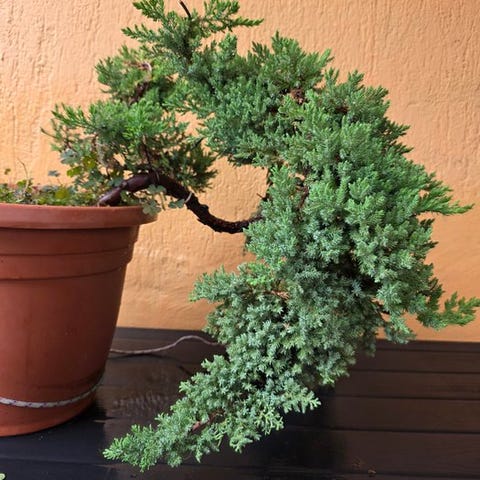 En 17-årig juniperbonsai fra Japan i hokidachi-stil, eviggrøn, med en stamme på 30 cm og træhøjde på 35 cm, i en keramisk potte der er 5 cm høj, 25 cm bred og 7 cm dyb, vægt 2,5 kg. Klik på den blå "gå til varen" knap, for at købe eller byde på denne vare. Den samlede pris vil blive vist inden du afgiver dit bud.