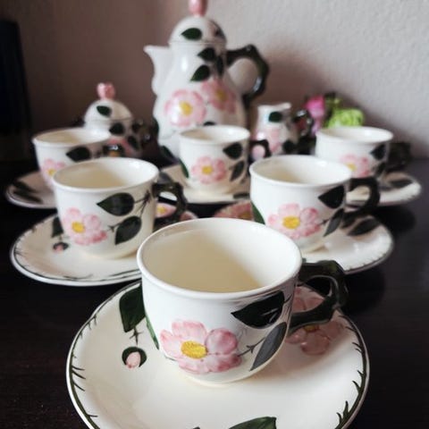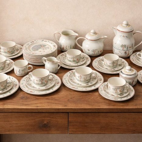 Servise til borddækning til kaffe, te, varm chokolade, småkager, vintage-ensemble, moderne, art nouveau, art déco, dybe tallerkener, skåle. Spisestel. Morgenmadsservice, dessert, entremet, kopper,.