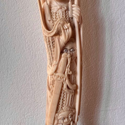 Et bronze okimono af en stående Ryū-drage, med grøn patina og forgyldt hoved, horn og dele af skæl, i en dynamisk holdning, dateret til Showa-perioden (midt i det 20. århundrede) og oprindelig fra Japan, dimensioner 16 cm bred, 10 cm dyb, 26 cm høj, i fremragende stand med patinavridsning, original ægthedscertifikat medfølger. Klik på den blå "gå til varen" knap, for at købe eller byde på denne vare. Den samlede pris vil blive vist inden du afgiver dit bud.