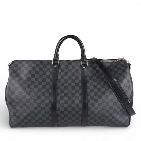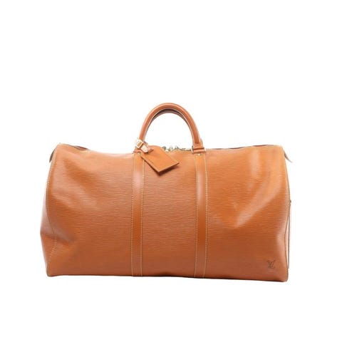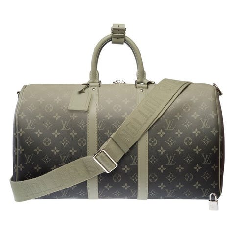 The Louis Vuitton Keepall Bandoulière 50 M59676 is a statement travel bag featuring a breathtaking landscape print on blue canvas with vibrant pink and green tones, blue leather trim, and silver-tone hardware—where luxury meets artistic escape.