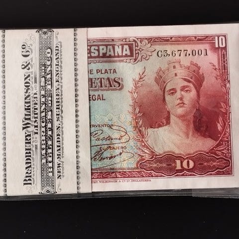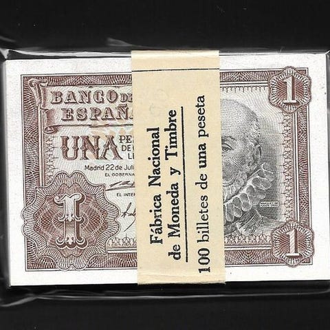 Lot af 100 sedler á 1 peseta, dateret 22. juli 1953, Marqués de Santa Cruz, Serie Z, alle fortløbende, med originalt bånd F.N.M.T Ed-465b. Klik på den blå "gå til varen" knap, for at købe eller byde på denne vare. Den samlede pris vil blive vist inden du afgiver dit bud.