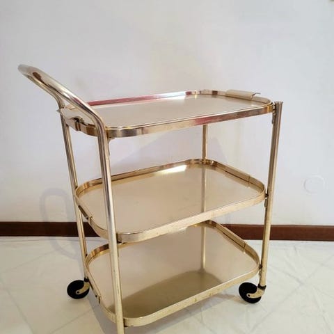 Mid-Century Modern træ barvogn fra Milano, Italien, fra 1950–1960, med to hylder og flaskeopbevaring, mål 92 cm bred, 76 cm høj og 45 cm dyb, brugt stand med sandsynligvis små manglende dele. Klik på den blå "gå til varen" knap, for at købe eller byde på denne vare. Den samlede pris vil blive vist inden du afgiver dit bud.