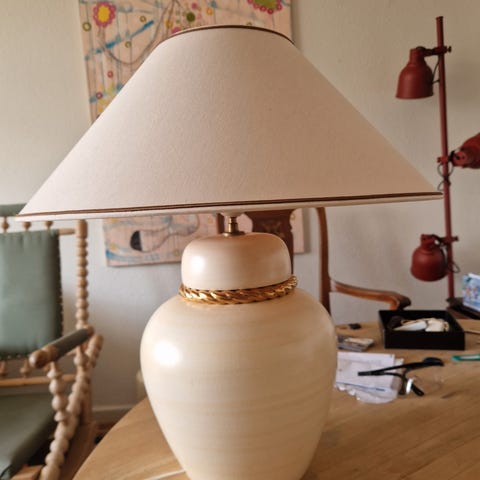 Et par keramiske bordlamper af Robert Kostka fra Frankrig, cirka 1970–1980, cremefarvede baser med stribet skærm, hver 67 cm høje og 35 cm brede, i fremragende fungerende stand. Klik på den blå "gå til varen" knap, for at købe eller byde på denne vare. Den samlede pris vil blive vist inden du afgiver dit bud.