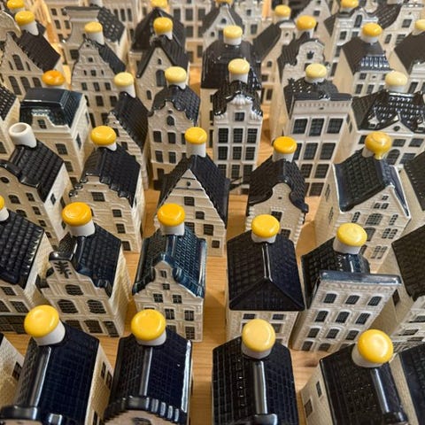 Meget tidligt KLM-hus nummer 4 kendt på Elly van Driels hjemmeside under variant 1A med håndmalet Plateelbakkerij Zuid-Holland mærke. Huset stammer altså fra perioden 1950-1958. Dette lille hus stammer således fra den allerførste begyndelse, da disse huse blev udgivet; her nævnes endnu ikke sprituafhængig leverandøren der udfyldte husene, og på undersiden er de håndmalet mærket Delft Blue Holland og 4 samt malerinitialerne MH.