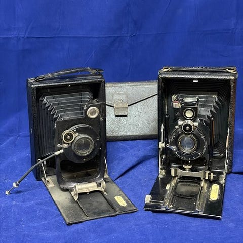 ICA Ideal 111 sammenklappelig plade kamera med Tessar 4,5/12 cm objektiv, kassetter og taske; film 6,5x9 cm, serienummer K.84735, anslået periode 1910–1920, i meget god fysisk stand og testet og funktionsdygtig. Klik på den blå "gå til varen" knap, for at købe eller byde på denne vare. Den samlede pris vil blive vist inden du afgiver dit bud.