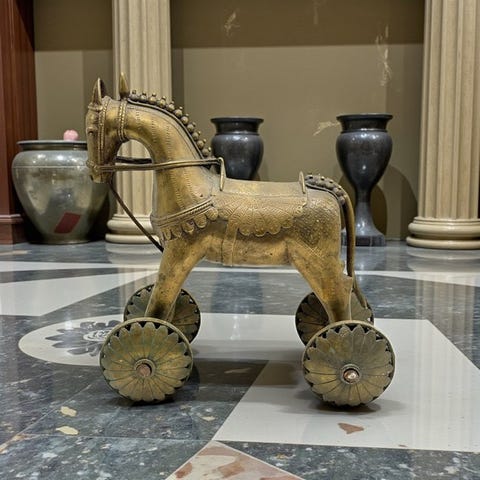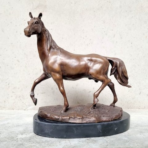 Bronzeskulptur af et hesteskæb med marmor-elementer, oprindelse Europa, mål: 30 cm høj, 16 cm bred og 10 cm dyb, i god stand. Klik på den blå "gå til varen" knap, for at købe eller byde på denne vare. Den samlede pris vil blive vist inden du afgiver dit bud.