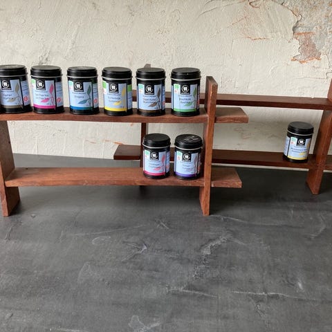 Komplet sæt i massiv teak fra 1990’erne, bestående af tre krydderibeskyttelses-kuber til te, kaffe og sukker, ledsaget af deres koordinerede bakke.