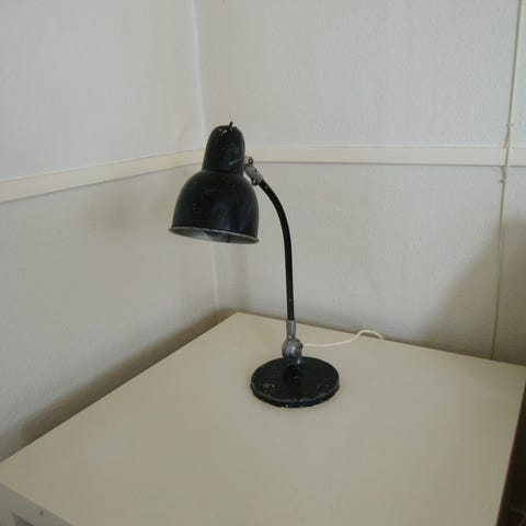 Sjældne, originale vintage bordlampe fra militære lager fra Ungarn, tidligere anvendt ved forhør. Det robuste industridesign og den autentiske patina gør den til et ægte blikfang for samlere, gør-det-selv-fans eller entusiaster af utraditionel indretning.