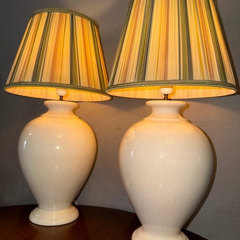 Lampens stofskærm i varm brun nuance (for nylig udskiftet med en lysere skærm, se billederne), hvilket giver en hyggelig, blød lysfordeling. Perfekt som natlampe, stemningsbelysning i stuen eller som et accentstykke i et vintage eller moderne interiør.