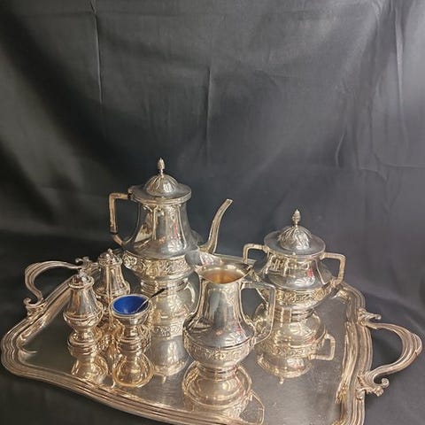 J. Boyer, Limoges – et komplet fransk Art Déco-kaffeeservice i Limoges-porcelæn fra ca. 1925–1940, hvidt med guld- og purpurdetaljer, inklusive 1 kande med låg, 1 sukkerkande med låg, 1 mælkekande, 6 kopper og 10 underkopper, dimensioner ca. 24 × 22 × 22 cm, samlet vægt ca. 6 kg, i fremragende stand uden revner, chips eller reparationer og undersiden mærket “J. Boyer – Limoges – France.” Klik på den blå "gå til varen" knap, for at købe eller byde på denne vare. Den samlede pris vil blive vist inden du afgiver dit bud.