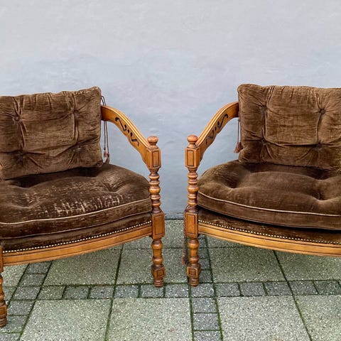 To antikke lænestole fra Giorgetti i Directoire-stil, af massivt træ (formodentlig mahogni) med flettede rattan-sider, med læderpolstring og originale messing dekortilgegn, produceret i Frankrig ca. 1900–1930, og sælges i rimelig brugstilstand med mulig manglende smådele. Klik på den blå "gå til varen" knap, for at købe eller byde på denne vare. Den samlede pris vil blive vist inden du afgiver dit bud.
