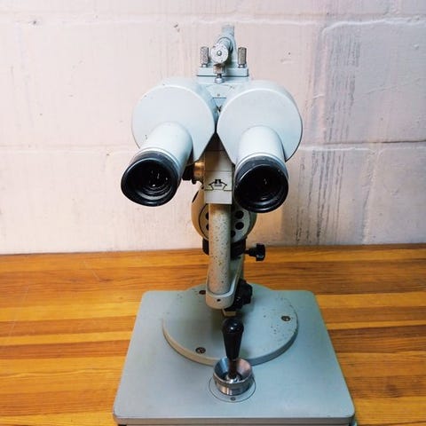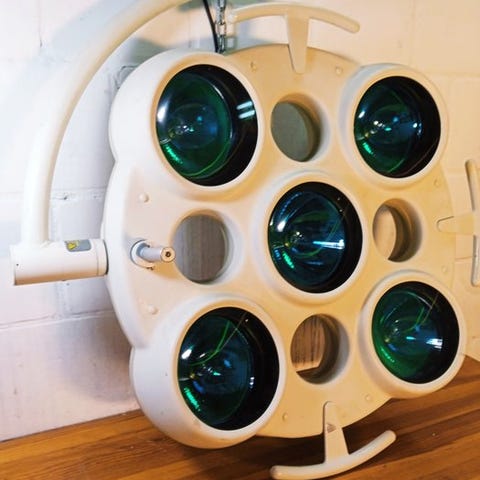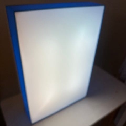 Der er et mælkefarvet glas foran det. Det blev brugt til at se røntgenbilleder. Der er originale metalophæng.