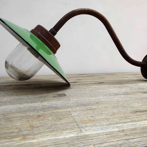 Smuk emalieret fabrikslampe med originalt metalrør og vægbeslag, formodentlig ungarsk industriproduktion fra første halvdel af det 20. århundrede. Nyforsynet ledning, nyt E27-skruegevind (2,5 cm). Udenpå originalt duerblågråt med fin patina, indvendigt hvid emalje, nystøbt. Vægmontering stabil, armen med originalt stålkabel til sikring.