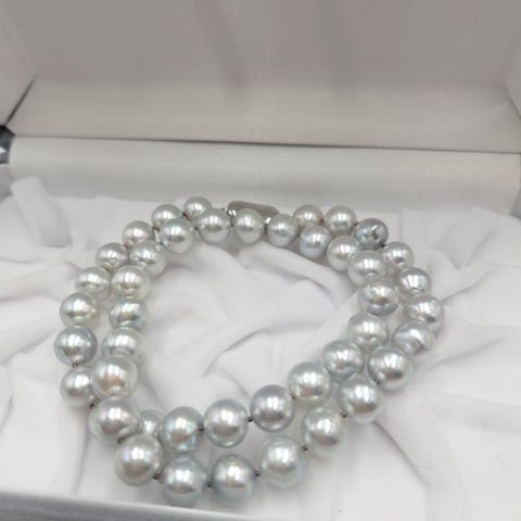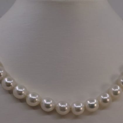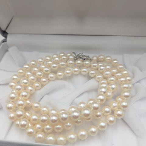 Sølv 925 halskæde med 49 Akoya kulturerede perler, runde, hvide, gradueret fra 8 til 8,5 mm, fremragende lustr, let pletter på overfladen, længde 45 cm, samlet vægt 40,2 g, ingen laboratorierapport. Klik på den blå "gå til varen" knap, for at købe eller byde på denne vare. Den samlede pris vil blive vist inden du afgiver dit bud.