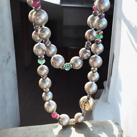 Sølv halskæde til kvinder med 36 Tahiti-kultiverede perler som hovedsten, barok hvide perler på 13 mm, længde 18 tommer, samlet vægt 81 g, ingen laboratorierapport. Klik på den blå "gå til varen" knap, for at købe eller byde på denne vare. Den samlede pris vil blive vist inden du afgiver dit bud.