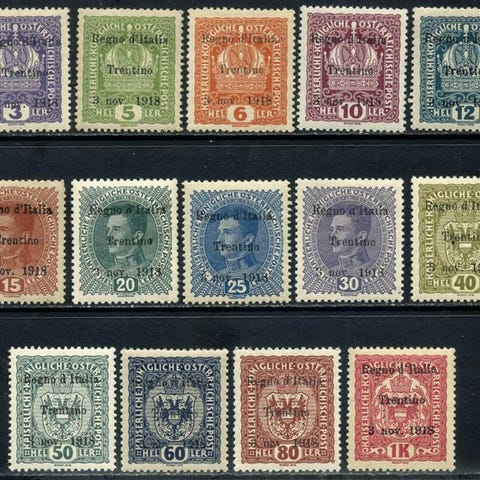 Italien, Trentino, mint-tilstand frimærker fra 1918, ni overtrykte værdier med titlen Francobolli d'Italia soprastampati, 9 valori, Sassone 19/27, certifikat Cilio. Klik på den blå "gå til varen" knap, for at købe eller byde på denne vare. Den samlede pris vil blive vist inden du afgiver dit bud.