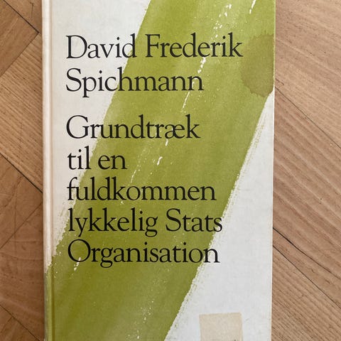 Grundtræk til en fuldkommen lykkelig stats organision, David Frederik Spichmann. Opr udgivet i Roskilde, 1843 med titlen Grundtræk til en fuldkommen lykkelig stats organisation i et nyt forhen ubeboet land. Udgivet og i indledt af Michael Helm. Meget velholdt udgave, hardback.
