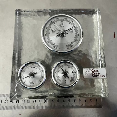 Tysk fremstillet Sputnik-stil vejrstation fra 1960’erne i messing og akrylglas, ca. 25 cm høj med vægbeslag, i god stand med mindre aldersmærker. Klik på den blå "gå til varen" knap, for at købe eller byde på denne vare. Den samlede pris vil blive vist inden du afgiver dit bud.