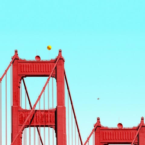 Dette fotografi blev koncipieret, produceret og udført uden kunstig intelligens. Optaget i San Francisco, Californien (2018). Fra serien "San Francisco" indfanger Téber Golden Gate Bridge og nærmer sig den på en minimalistisk måde.