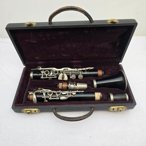 Klarinet i Bb, 18 nøgler. Krop i ebonit, nøgler belagt med sølv, med dobbelt barillet, etui af skum med rengøringsklud, mundstykke, ligatur og læbe/blad