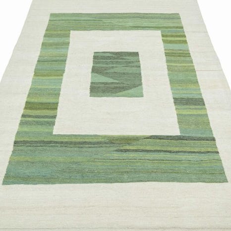 Et højkvalitets håndvævet designer-kelim, der imponerer med sine friske grønne nuancer og klare linjer.