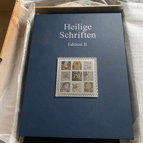 Sjælden Zürich-udgave af en bibel fra 1665 med titel Die Propheten & Apocrypha & Das Neue Testament, bundet i blindpræget svinehud, 26,5 × 20 cm, 1200 sider, på tælsk tysk, udgivet af Bodmerischen Truckerey, Zürich; i god stand med brugsspor, god binding, let plettet, en lås kan ikke lukkes, en lås har tape fastgjort. Klik på den blå "gå til varen" knap, for at købe eller byde på denne vare. Den samlede pris vil blive vist inden du afgiver dit bud.