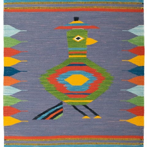 Charakterstærk håndvævet designer-kilim med stiliseret dyremotiv i markante farver. Den harmoniske kombination af Grøn, Rød, Blå og Gul giver dette kilim en livlig, etnisk inspireret udstråling og gør det til et særligt blikfang.