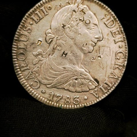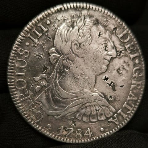 8 reais sølvmønt fra Carlos III, 1781, præget i Potosí, Bolivia; vægt 26,73 g; XF KM55; chopmarks. Klik på den blå "gå til varen" knap, for at købe eller byde på denne vare. Den samlede pris vil blive vist inden du afgiver dit bud.