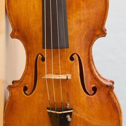 En fuldstørrelse træviolin med etiket Paolo de Barbieri Genova, fremstillet i 1948, i fremragende stand, testet og spilbar, med strenge og kinstøtte, vægt ca. 0,5 kg. Klik på den blå "gå til varen" knap, for at købe eller byde på denne vare. Den samlede pris vil blive vist inden du afgiver dit bud.