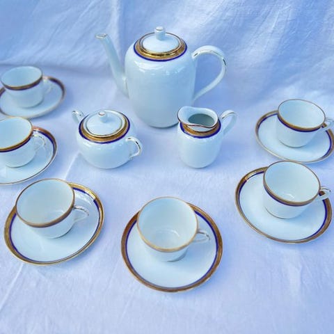En service bestående af 10 bouillon-/consommé-kopper med underfad, dekorationer i koboltblå og sølv fra 1930’erne/1940’erne i 1900-tallet. Sættet er i fremragende vintage-tilstand, sandsynligvis aldrig brugt, har få tidsrelaterede fejl og nogle oprindelsesfejl, alle angivet i billederne som udgør en integreret del af beskrivelsen.