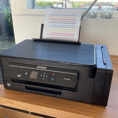 Epson EcoTank ET-2811 printer og scanner med WiFi. EcoTank-system med genopfyldelige blæktanke. Anvender Epson 104 blæk og er ekstremt billig i drift. Som man kan se på billedet er der masser af blæk tilbage. Velegnet til udskrivning i farve og sort/hvid i hjemmet eller på mindre kontorer. Indbygget trådløs forbindelse via WiFi for netværks- og mobiludskrivning med Epson Smartpanel-appen eller direkte via AirPrint.
