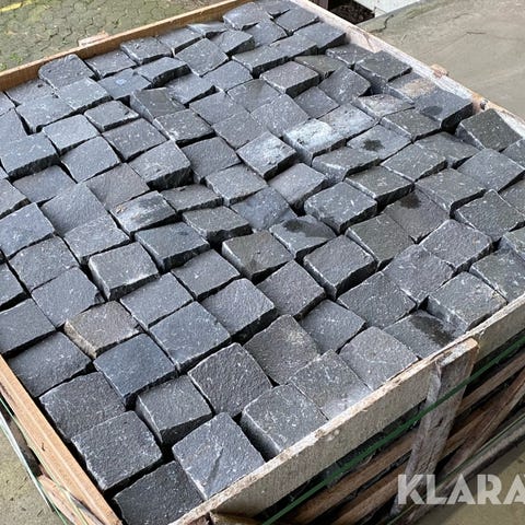 Ca 2500 chausses sten i granit med grålige farver - og ikke den helt hvide slags. Skal selv tages op. Trailer (mindre type) kan køres delvist ind i haven, så det kan køres med trillebør i mindre læs. Trillebør skal selv medbringes.