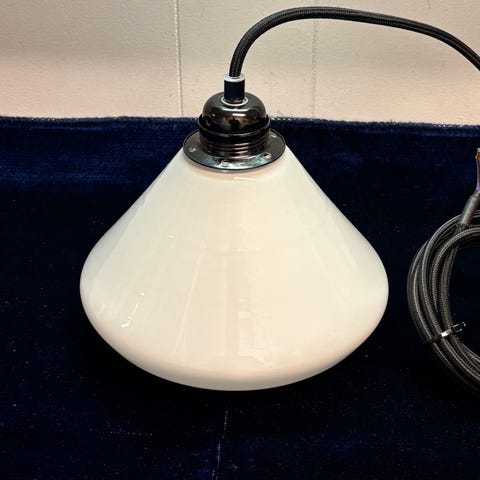 Hvid pendel lampe med kuppelformet skærm. Lampen hænger i ledning fra loftet og giver nedadrettet lys, velegnet over bord eller i hjørner af rummet. Enkel og neutral farve, der passer ind i mange typer indretning.