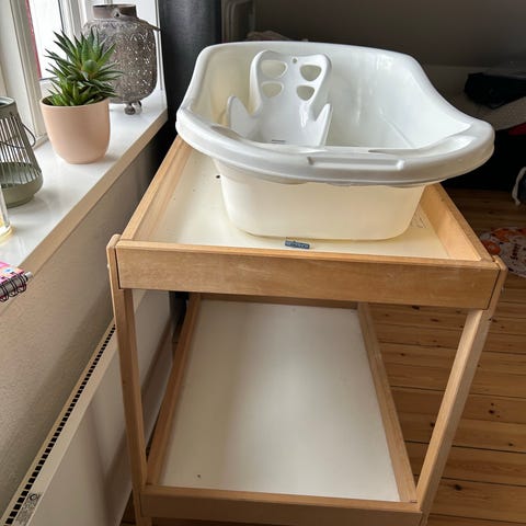 Troll puslebord i hvidt træ med integreret pusleplads og høje kanter på tre sider. Bordet har en stor skuffe under puslefladen til opbevaring af pusleting samt to åbne hylder med lameller forneden. Velegnet til pusleområde på badeværelse eller i børneværelse, hvor der er behov for fast pusleplads og opbevaring tæt ved hånden.