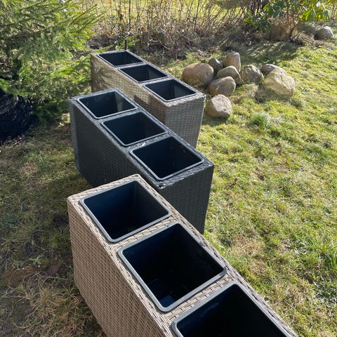 Plantekasse med 3 separate indsats-krukker i plast. Yderkassen har flet-look i beige/naturfarve og er egnet til udendørs brug på terrasse, altan eller i have. De sorte plastindsatser har drænhuller i bunden, så overskydende vand kan løbe fra. Velegnet til beplantning med blomster, krydderurter eller mindre buske.