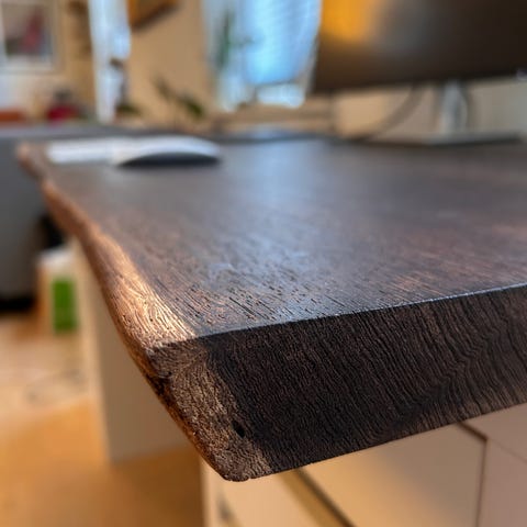 Træplade i massivt egetræ. Skal tilvirkes. Rå kanter, skal slibes. Kan anvendes som lille hylde, bordplade, skærebræt, serveringsbræt, bræt til kaffemaskinen eller dekorationsplade afhængigt af mål og behov.