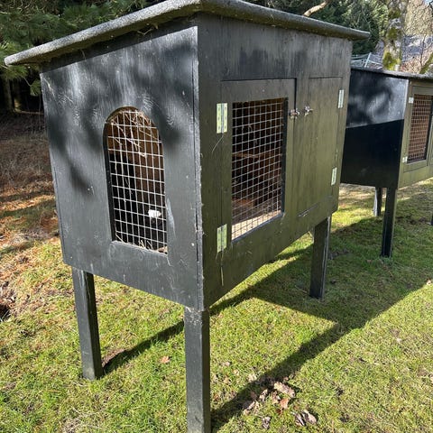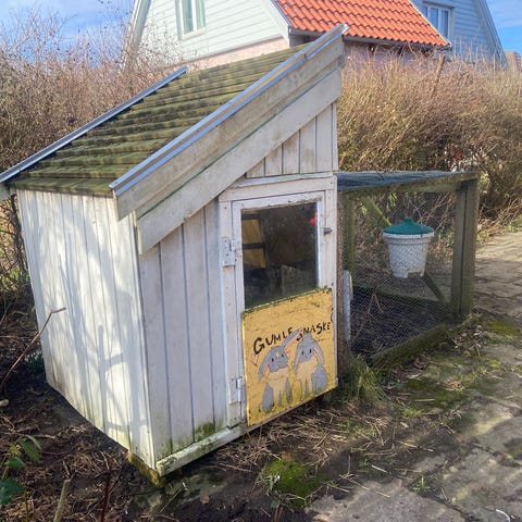 Kaninhus i træ, Huset har lille dør med vinduesfelter samt separat låge forneden. Løbegården er indhegnet med trådnet og har adgang fra huset. Velegnet til hold af høns eller mindre fjerkræ i haven, hvor dyrene har både beskyttet hus og udendørs areal i samme enhed.